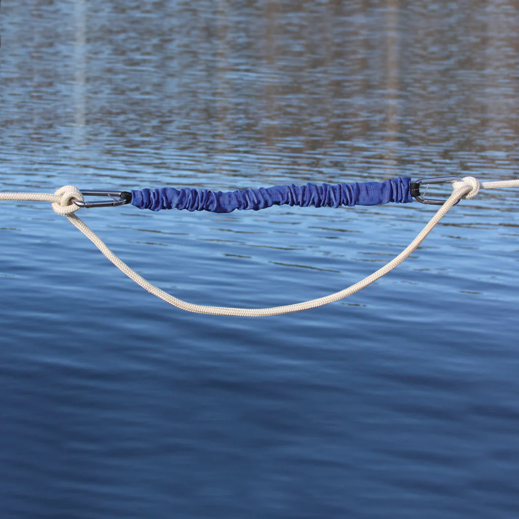 - Includes: 1) Blue LineSnubber with two 316 Stainless Steel Clips 20″ (51 cm) length when relaxed. 2) Can stretch to a maximum length of 36″ (91 cm).