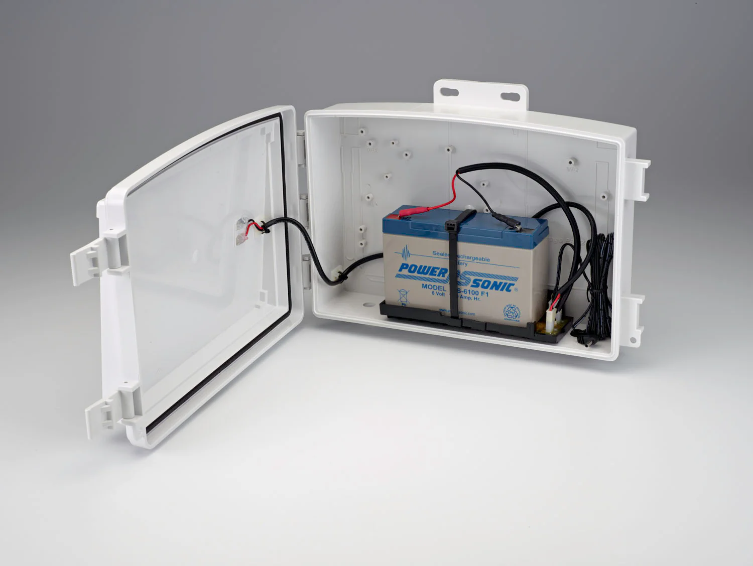 - Includes 5.0-watt solar panel, weather-resistant shelter, regulator circuit, 1.4-amp-hour 6-volt rechargeable battery and 10 ft. (3 m) cable.